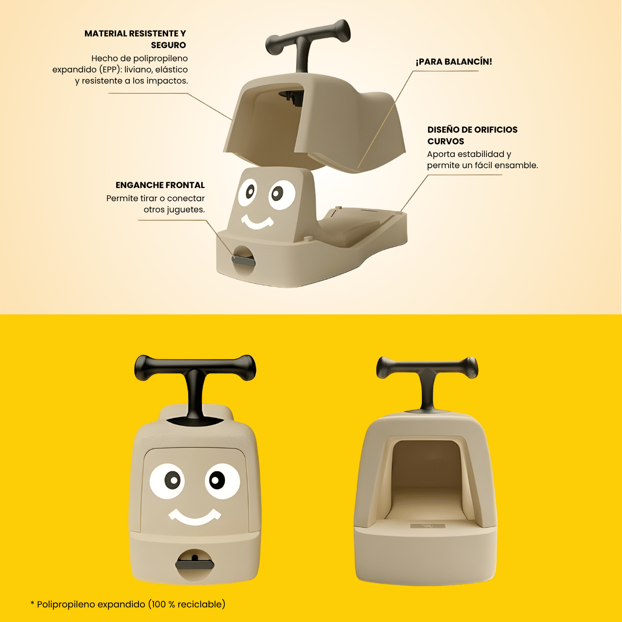 Poly está fabricado con el material EPP ecológico, número 1 en Europa de juegos para niños. Es completamente libre de sustancias nocivas, garantizando la salud y seguridad de los bebés mientras lo usan.